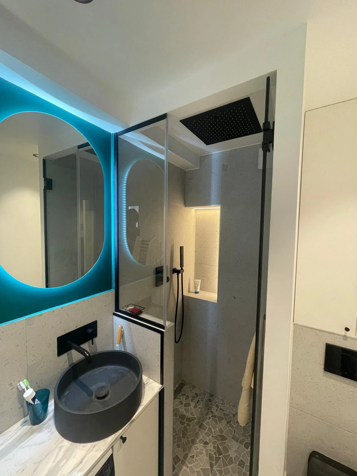 Plomberie : dépose de l’existant, remplacement des colonnes d’alimentation et évacuations, mise en place de réseaux cuivre/multicouche avec raccordements sanitaires et cuisine.